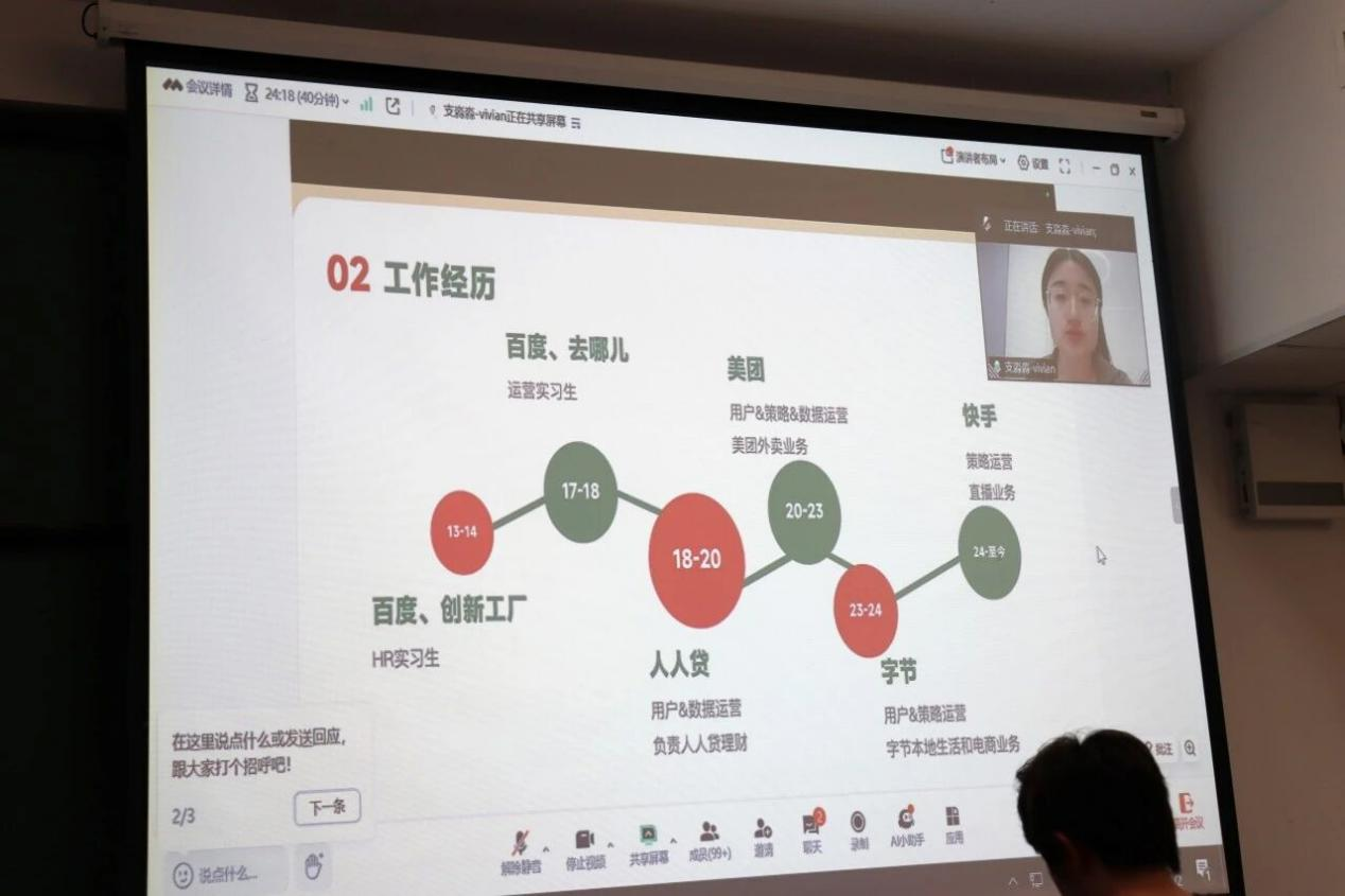 支晓静学姐毕业后先后在百度、美团、字节、快手等互联网大厂工作,她分享了在互联网行业工作的体验,通过解析互联网行业特点,为同学们提供了从实习选择到职业跃迁的实操建议,并现场解答了关于工作强度、跳槽策略等热点问题。