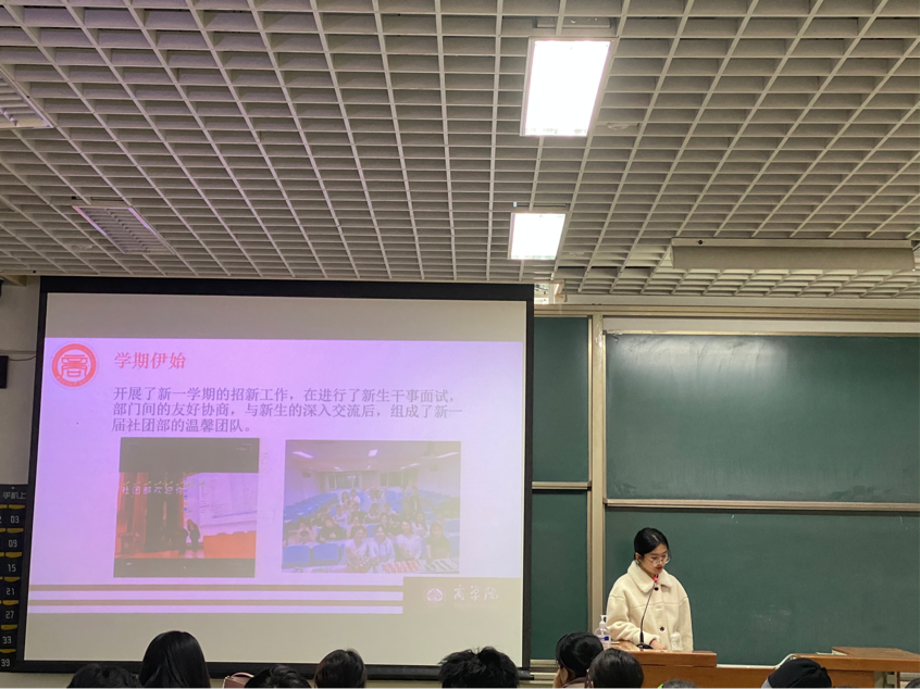 总结会上,威尼斯人娱乐场 团委副书记赵方洲、王怡玲、李宇涵分别介绍威尼斯人娱乐场 团委组织部、团建部、新闻部、班建部、宣传部、社团部等建设情况,总结了本学期学社衔接、素质拓展、团校、征兵宣传、新闻宣传等工作开展情况;学生会执行主席王明溪、主席团成员李千晴、吕天逸分别介绍了办公室、体育部、生活部、心资部、学术部、文艺部、舞团等部门的招新和发展情况,总结了本学期新生运动会、129合唱及表彰、模拟人生、新生篮球足球赛、辩论赛等各项工作取得成绩和有待改进的方面;青志协会会长陈沐渟介绍了青志协、外联部的工作情况,对本学期开展的有关志愿服务等工作进行了总结。
