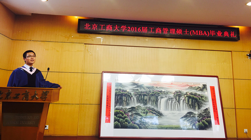 2014级秋季班班长田献飞代表2016届MBA毕业生发言,他表示感谢母校的培养和帮助,难舍两年的工商生活和同窗情谊,今后会更加努力地生活和工作,不辜负母校和老师的殷切希望。