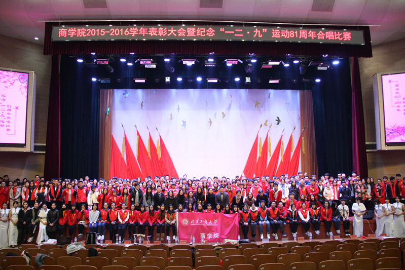 表彰大会之后是纪念“一二•九”运动81周年“我手携我心,共圆中国梦”合唱比赛,本次比赛共分为峥嵘岁月、青春年华、鹏程万里三个篇章。比赛中,2016级15个新生班级轮番登场,曲目中既有《游击队歌》《歌唱祖国》等红色经典,也有《倔强》《青春纪念册》等青春独白,亦有《仰望天空》《我的未来不是梦》等未来憧憬。在同学们的生动演绎下,观众仿佛可以看到八十多年前中国青年的奋力抗争,为中华之崛起而付出一切;又能得见如今中国如巨龙腾飞,雄踞于世,吾辈热血一如当年,爱国精神从不泯灭;还展望了未来,民族复兴任重道远,肩上责任代代相传,砥砺前行,中国梦必将实现!