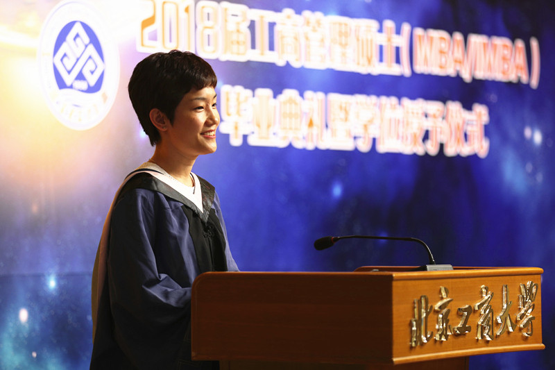 两年来MBA涌现出一批优秀的学生,杨浩雄副院长宣读了优秀毕业论文、优秀毕业生名单,并由嘉宾为他们颁奖。毕业生代表闫擎一同学在发言中表达了她心中MBA三个字母:M-mad,疯狂地追求一种改变的可能;B-busy,忙碌的意义,用多一点点的辛苦,交换多一点点的幸福,实现梦想的幸福,或许就在不远处;A,awesome,棒棒哒,一种努力达成目标后棒棒哒的快乐。感恩北京工商大学,感恩在校园里度过的两年时光!