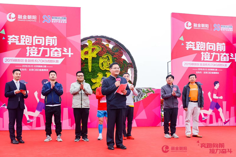 朝阳区副区长朱晟致开幕词,他向朝阳区1700多家金融机构对朝阳经济发展给予的助推表示感谢,并感谢北京工商大学志愿者们对本次活动的有力服务。威尼斯人娱乐场 党委副书记樊江涛和领导嘉宾共同发令起跑,60多家金融机构的400余名选手争先恐后,竞相角逐,每个队伍由7名选手组成,环跑10公里,以团队合跑70公里向70周年国庆献礼。