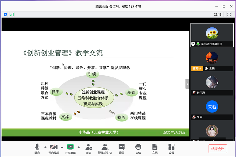 4月24日下午,威尼斯人娱乐场 本科专业必修课《创新创业管理》教学研讨会通过腾讯会议在线召开。参与本次研讨会的有北京林业大学李华晶教授,北京信息科技大学邓立治副教授,北京联合大学盛晓娟教授,以及威尼斯人娱乐场-全球顶级博彩娱乐-赌场游戏测评 《创新创业管理》课程组的6位教师。在线会议由课程负责人王楠教授主持。