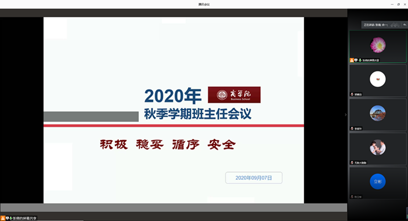 威尼斯人娱乐场 党委副书记张倩传达了新学期学校关于学生返校入校的要求和校园管理规定,介绍了威尼斯人娱乐场 的本科生返校和新生报道工作方案以及近期重点开展的学生工作,就老生返校和新生报到的学生对接、健康打卡、综合测评、就业升学形势等情况作了汇报;将学生返校前、返校途中和返校后的各项准备、安排及要求作了细致解读,希望班主任能够摸清所负责的学生的各项底数、认真组织召开“云班会”,向学生阐明北京市和学校的各项疫情防控要求,做好学生的思想动员和引导教育工作;特别就17级本科生搬家和20级新生入学报到事宜作了说明,希望相关班主任老师能够积极走访宿舍,给予学生面对面的关心关爱;动员全体班主任和辅导员老师对人才培养目标进行深入思考,结合班级情况及学生发展成长规律,对学生进行针对性指导,班主任、任课教师、辅导员能够共同努力确保“369”目标的实现与提升。