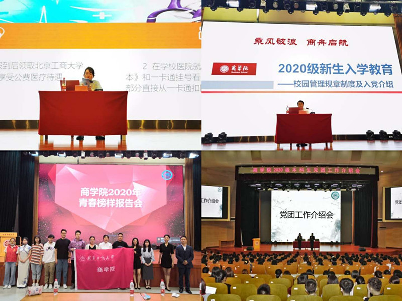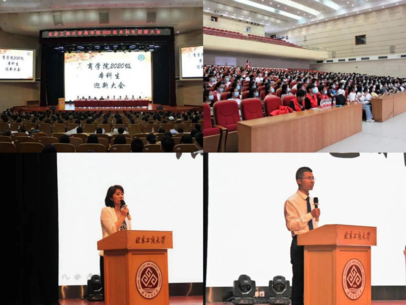 、管理与服务、就业与发展、成长与成才这四个维度展开讲解,介绍了人才培养目标、千人大考、四六级奖励政策、商梦花开学习辅导团体等组织和开展情况。工商类201班李佳函和注会202班睦佳杰两位新生代表表示要在大学中脚踏实地抓学习,砥砺前行共成长 ,共同谱写人生新华章。
