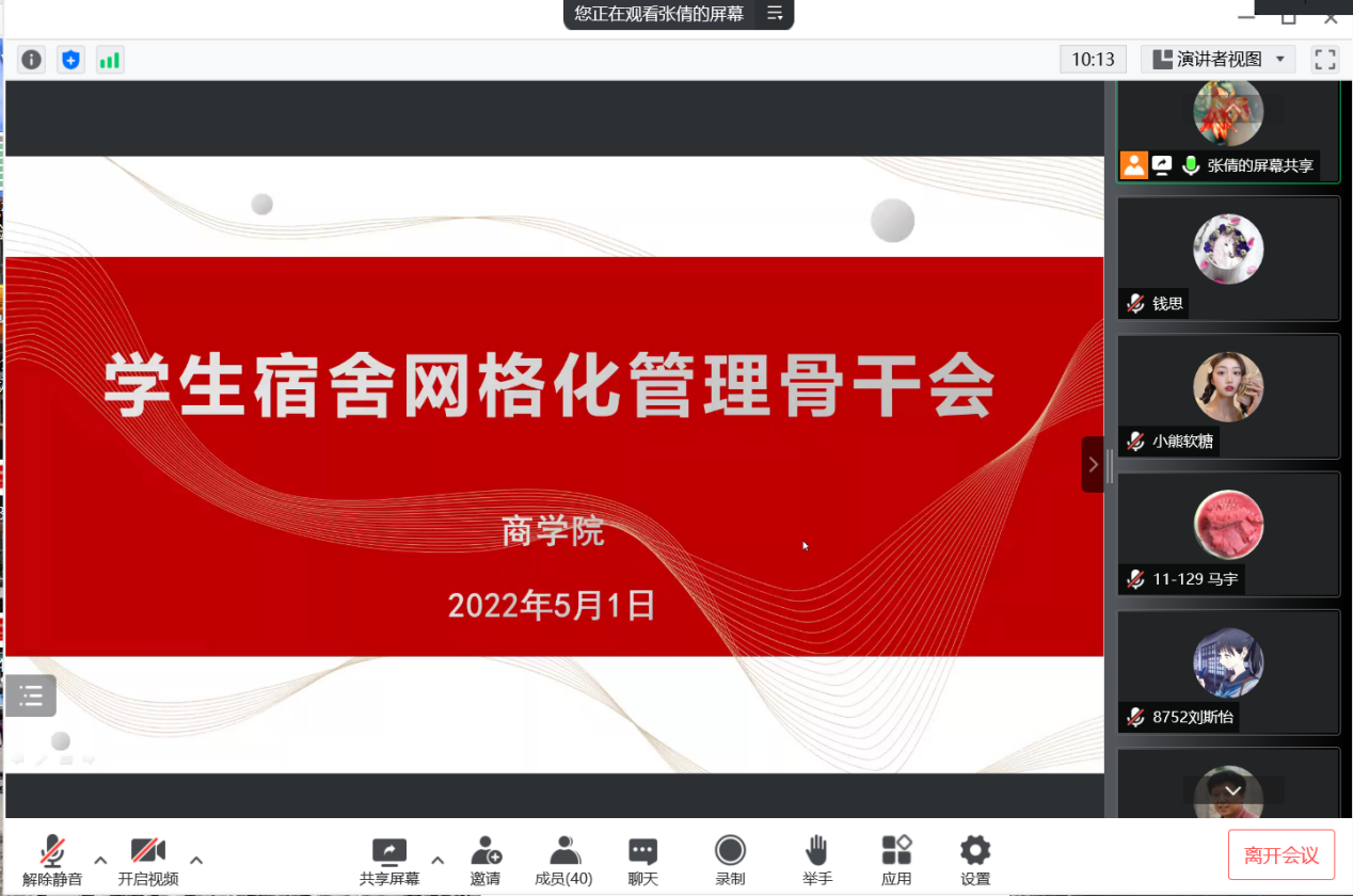 会上,威尼斯人娱乐场 党委副书记张倩首先简单介绍了学校周边的疫情情况,介绍了学校和威尼斯人娱乐场 为保障师生生命安全和身体健康在临时管控期间的多项措施和安排;介绍了威尼斯人娱乐场 学生宿舍网格化管理体系建立的背景,对大家在特殊时期能够勇挑重担的品格和为同学服务的精神表示充分肯定和由衷感谢;介绍了网格化管理中楼长、层长、舍长在信息报送、应急准触发、思想引领、关心关注、沟通协调、日常保障及管理等方面所应承担的岗位职责及工作要求。她强调,本科生和研究生宿舍网格化管理队伍是由辅导员择优推荐并确定的,威尼斯人娱乐场 构建“领导小组-辅导员-楼长-楼层长-舍长”学生宿舍管理体系,一方面为确保防疫筛查切实落实、应急事件快速有效处理,守好学生安全责任;另一方面也是落实实践育人、不断强化学生骨干能力提升及商科人才培养。她希望网格中的骨干成员应听从指挥、服从管理、各司其职、全力落实,全面掌握并及时反馈同学实际情况,切实提升组织管理能力,服务他人、收获成长。