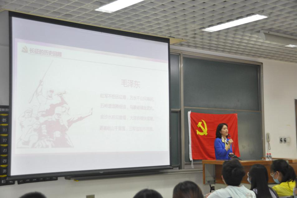 张春萍从长征的历史回顾、长征精神的内涵和意义、如何传承长征精神三方面与学生党员进行了讲解和交流。她首先强调了学习党史的重要性,引用了习近平在党史学习教育动员大会上的讲话中关于“进一步发扬革命精神,始终保持艰苦奋斗的昂扬精神”的要求,强调了学习和传承共产党人精神谱系的重要意义。随后,师生以共同朗诵毛主席的《七律·长征》拉开序幕,追溯长征峥嵘岁月。张春萍书记讲解了长征中的重大事件、克服的困难和取得的成绩,提炼出伟大的长征精神,并阐述了长征精神的深刻内涵和伟大意义。