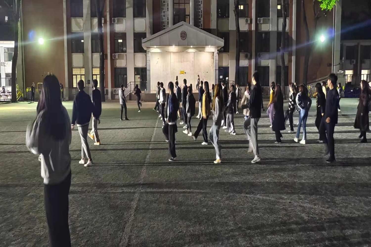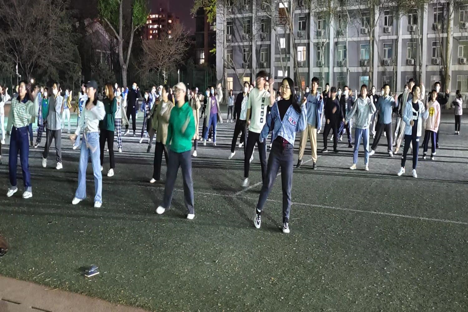 每晚七点半,同学们准时在操场集合。伴随着《日不落》等热门曲目,在领舞们的带领下,大家情绪饱满,时而趋步辗转,时而跨腿踏步,不停变换着舞姿,用激情洋溢的舞蹈展现了青年人健康向上的精神面貌。