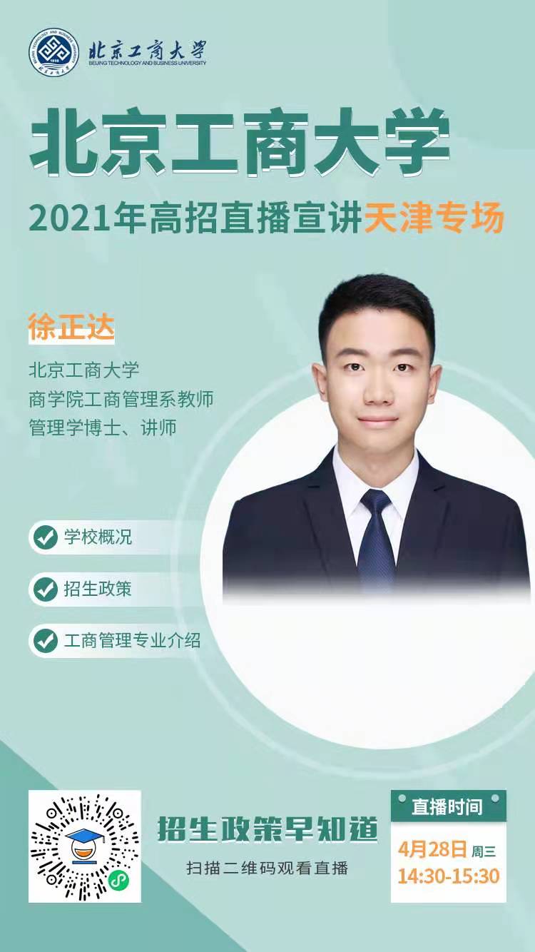 工商管理系徐正达老师进行了天津专场的直播宣讲,主要介绍学校概况、招生政策等内容,并着重介绍了我院工商管理专业概况和招生情况。