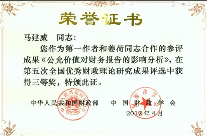 马建威副教授获得第五次全国优秀财政理论研究成果三等奖。该获奖成果为论文《公允价值对财务报告的影响分析》,发表在北京工商大学学报(社会科学版)2010年第五期。