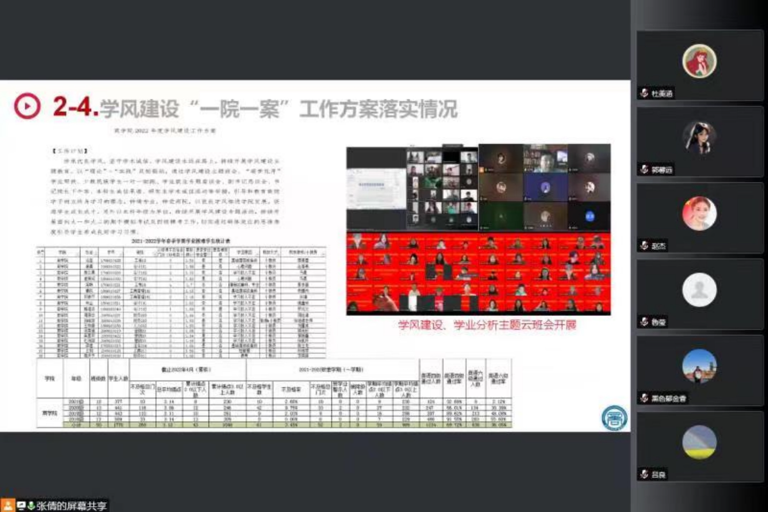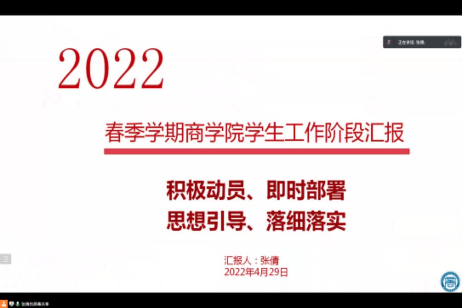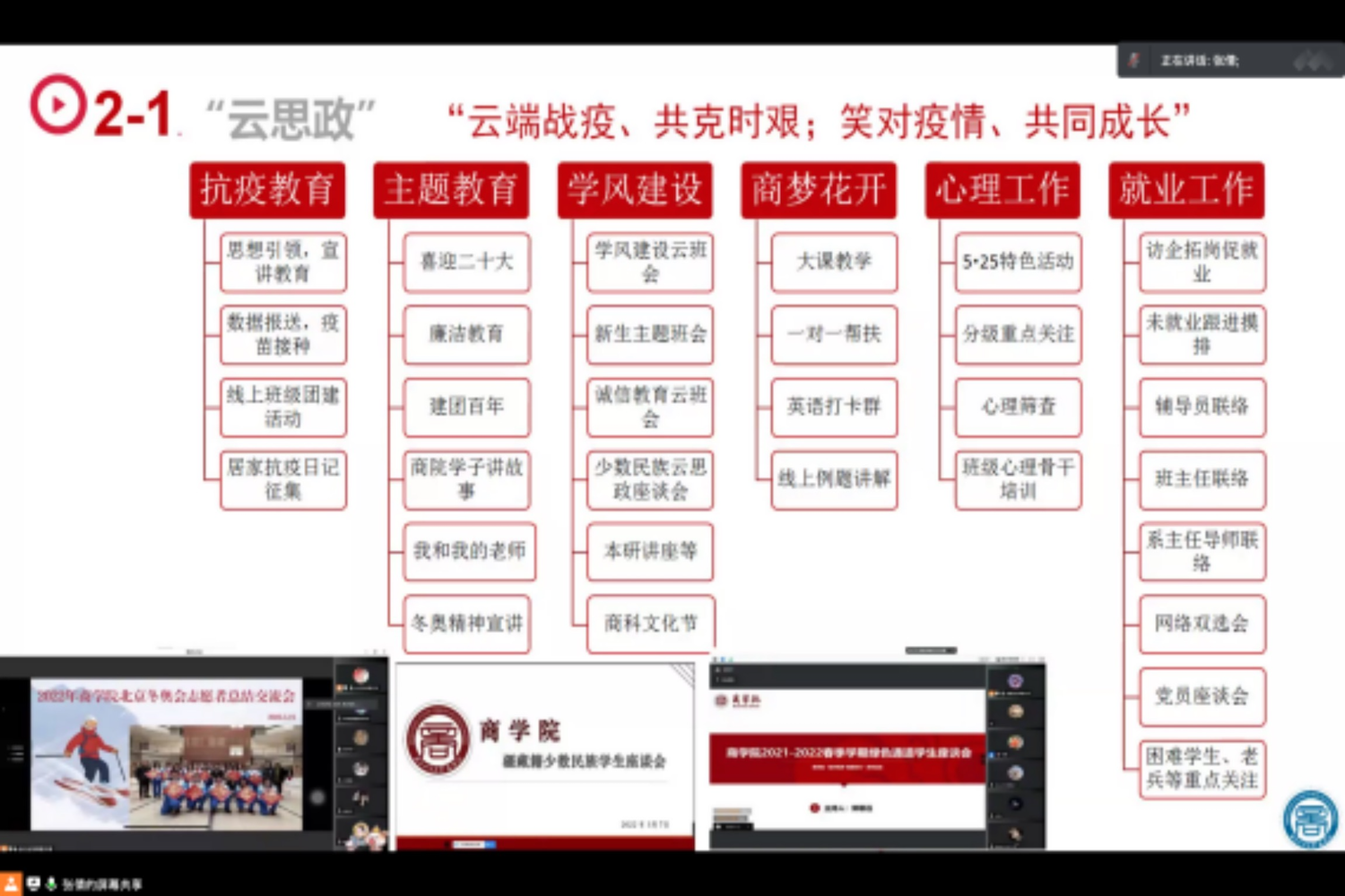 会上,威尼斯人娱乐场 党委副书记张倩首先代表威尼斯人娱乐场 对学生处莅临指导表示热烈欢迎,并对学生处长期以来对我院学生工作的支持和指导表示感谢。之后,她结合威尼斯人娱乐场 学工队伍长期以来形成的“积极动员、及时部署、思想引导、落细落实”的工作理念和思路进行专题汇报。她介绍了威尼斯人娱乐场 学生的基本情况及学工队伍现状,随后围绕云思政工作计划及落实情况、重点关注学生工作开展情况、家庭经济困难学生档案与身份复查情况、学风建设“一院一案”落实情况、心理重点关注学生工作开展情况、学生疫情防控排查工作落实、研究生学术活动“一院一品”建设情况等七方面专项工作开展情况进行了汇报。之后介绍了威尼斯人娱乐场 在外培生管理、家校协同等方面面临的问题,希望能够获得进一步的支持。之后辅导员老师们分别就学生线上学习的精神状态、副书记恳谈会开展情况、考研指导纵向交流活动、商梦花开学风传承示范基地建设等方面进行了补充汇报。