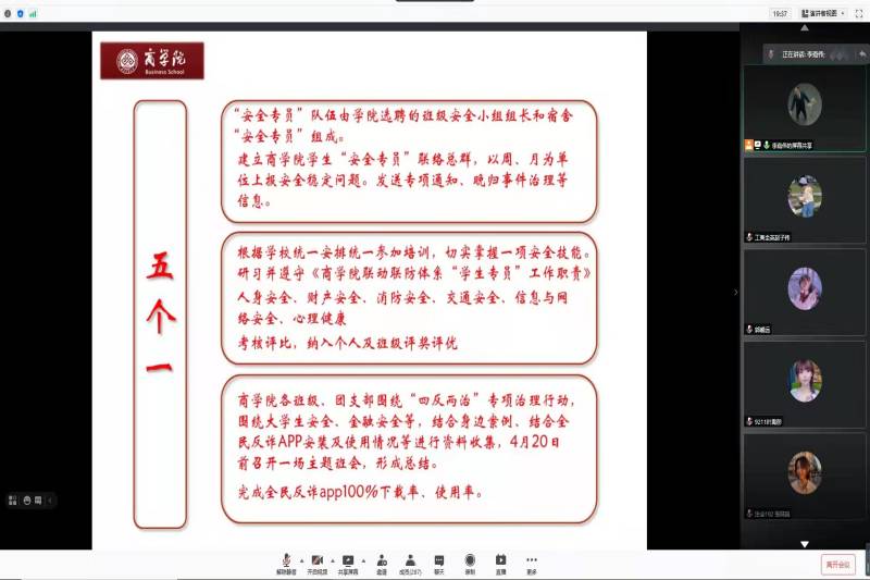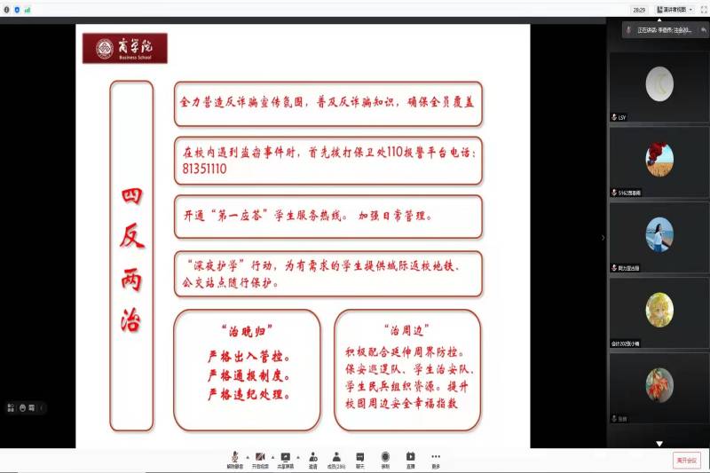 4月2日中午,威尼斯人娱乐场 学生工作办公室面向270余名学生安全专员开展了线上动员会。参会的学生安全专员是由威尼斯人娱乐场 选聘的班级安全小组组长和宿舍“安全专员”组成,学生工作办公室全体教师参会。会议开始,由威尼斯人娱乐场 辅导员李嘉伟老师为良乡校区安全专员队伍就威尼斯人娱乐场 “四反两治”专项治理行动方案进行了解读,对威尼斯人娱乐场 拟开展“五个一”行动做了具体说明,即:建立一套联动机制、掌握一项安全技能、召开一场主题班会、讲述一个反诈案例、增强一份安全意识;并对学校近期开展的具体暖心措施特意进行了说明。威尼斯人娱乐场 党委副书记张倩总结讲话,她指出,威尼斯人娱乐场 是学校“大家”的重要组成部分,师生要齐心协力,努力营造安全、温馨、幸福的学习生长环境;希望学工团队和学生安全专员要高度重视、提高警惕、增强安全意识;要通力合作、严格落实、构筑平安校园;要师生联手、同向发力、守护校园安全。