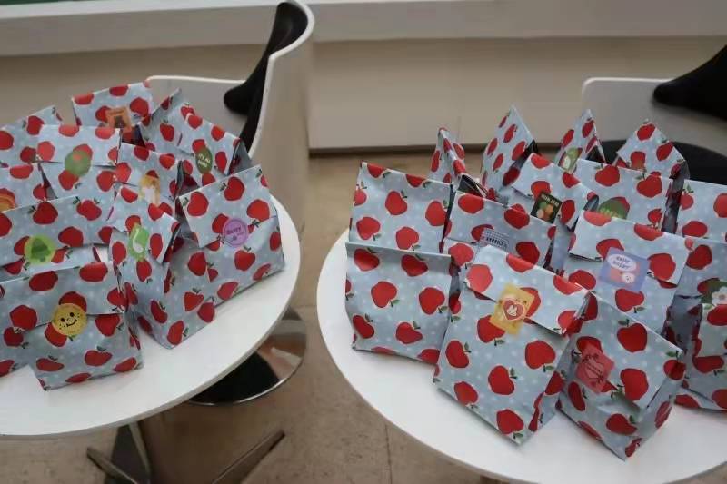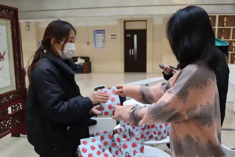 在考研学子们仍在抓紧最后的时光紧张复习之际,威尼斯人娱乐场 心资部的同学们早早来到商楼大厅为家庭经济困难的考研学子们精心准备小礼袋。画满红苹果的蓝白相间小礼袋里装着又大又红的苹果和一张满载着祝福语的卡片。苹果有着放“苹”心态、“苹”稳上岸、一定能“果”线的寓意,寄托着学弟学妹们对考研学子的祝福;卡片上写有大家精心准备的鼓励话语,言语间希望这些考研的学长学姐们能摘取胜利的桂冠,不负过去伏案桌前、泛舟书海的自己。