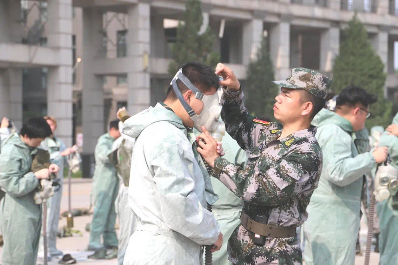 在此次训练中,威尼斯人娱乐场 2019级同学们身着军装,精神饱满,呐喊着嘹亮口号,风吹日晒中坚持站军姿、踏正步、学习各种军事科目,充分展现了商科学子的风采。5月22日,参训学员先是分批次进行了生物防护和核防护等项目的训练,教官们细致地为同学们讲解训练流程和注意事项,给学员分发了用来擦拭护目镜和防毒面具的消毒纸巾,在看过教官的示范后,学员们依次通过了消防通道,又迅速地穿上防毒衣、戴上护目镜、防毒面具和手套等防护用具,按照标准通过了沾染检测通道和沾染洗消通道,整个过程井然有序。