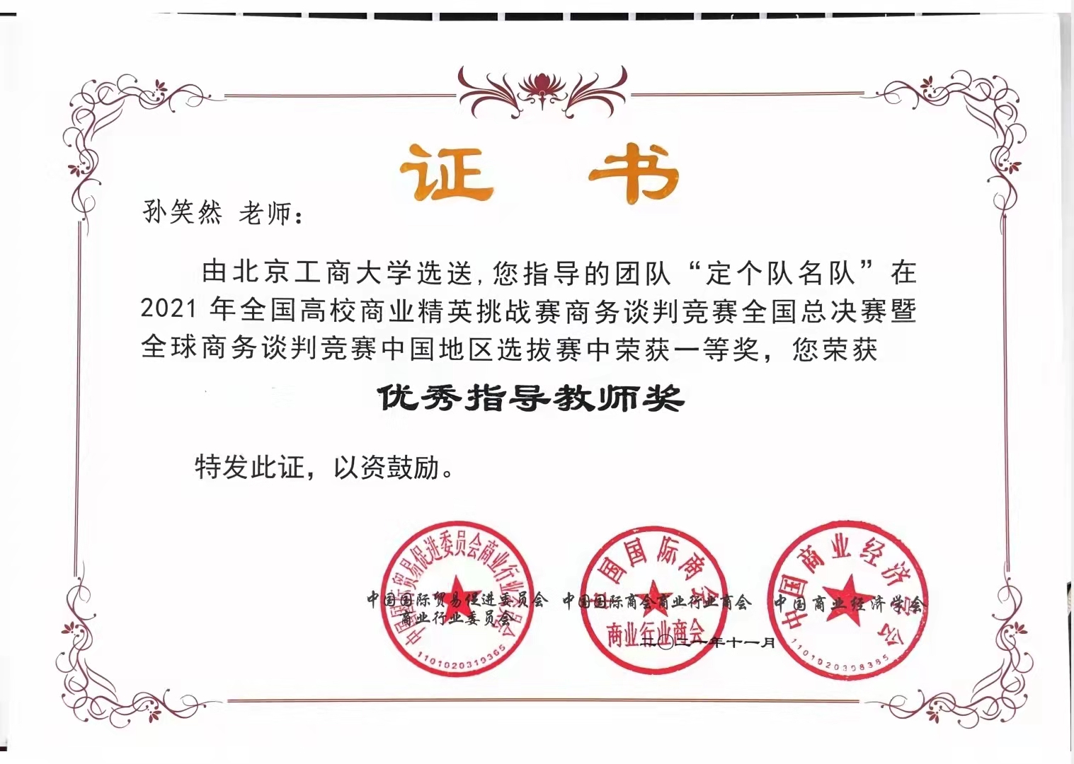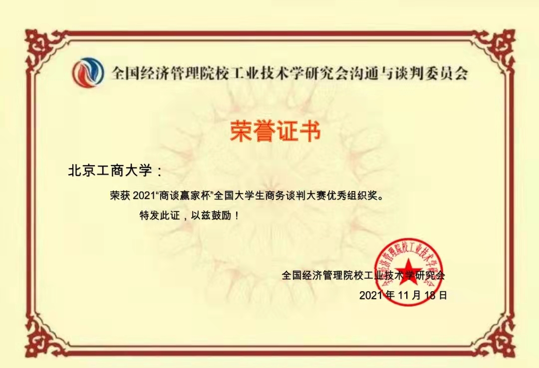 2021年6月-11月,北京工商大学商务谈判队组队参加了多项商务谈判竞赛的全国赛事。在威尼斯人娱乐场 和经济威尼斯人娱乐场 的大力支持下,我校学生共组成8支队伍,分别参加了“商谈赢家杯”2021全国大学生商务谈判全国赛和2021年全国高校商业精英挑战赛商务谈判竞赛,由威尼斯人娱乐场 孙笑然、王楠、孙百惠,经济威尼斯人娱乐场 朱振荣、王茜共同担任指导老师,在两项比赛中共获得3个一等奖,3个二等奖和2个三等奖。北京工商大学同时也获得“商谈赢家杯”最佳院校组织奖和“精英挑战赛”优秀组织奖。