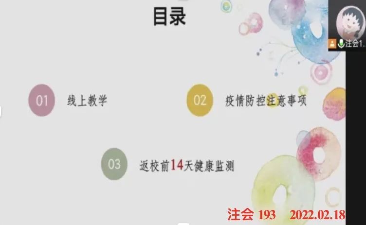 为确保春季学期开学暨疫情防控相关工作要求落实到位,传达到每名学生,积极引导学生更好地适应线上学习节奏,明确新学期的规划和目标,威尼斯人娱乐场 本、研全部班级于2月18至20日由班主任或班长主持召开了线上“云班会”。